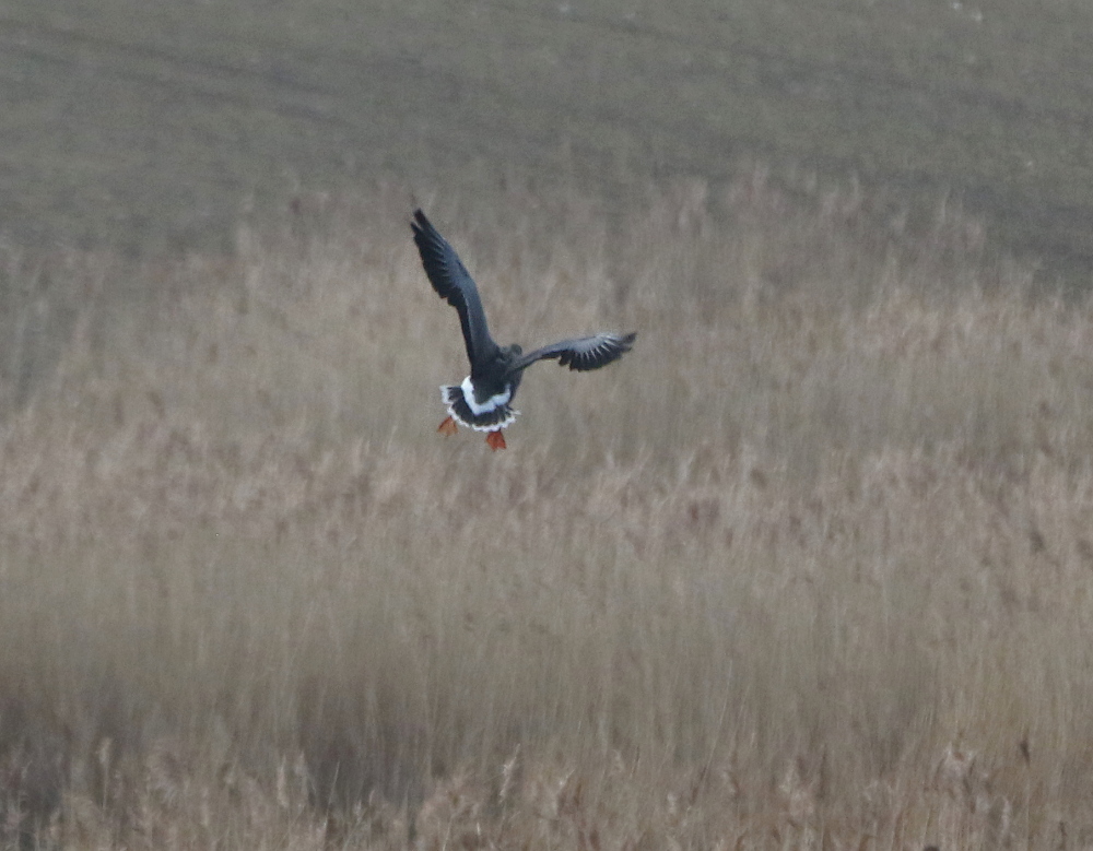 Beskrivelse: Dværggåsen gik sammen med en flok grågæs og to blisgæs.