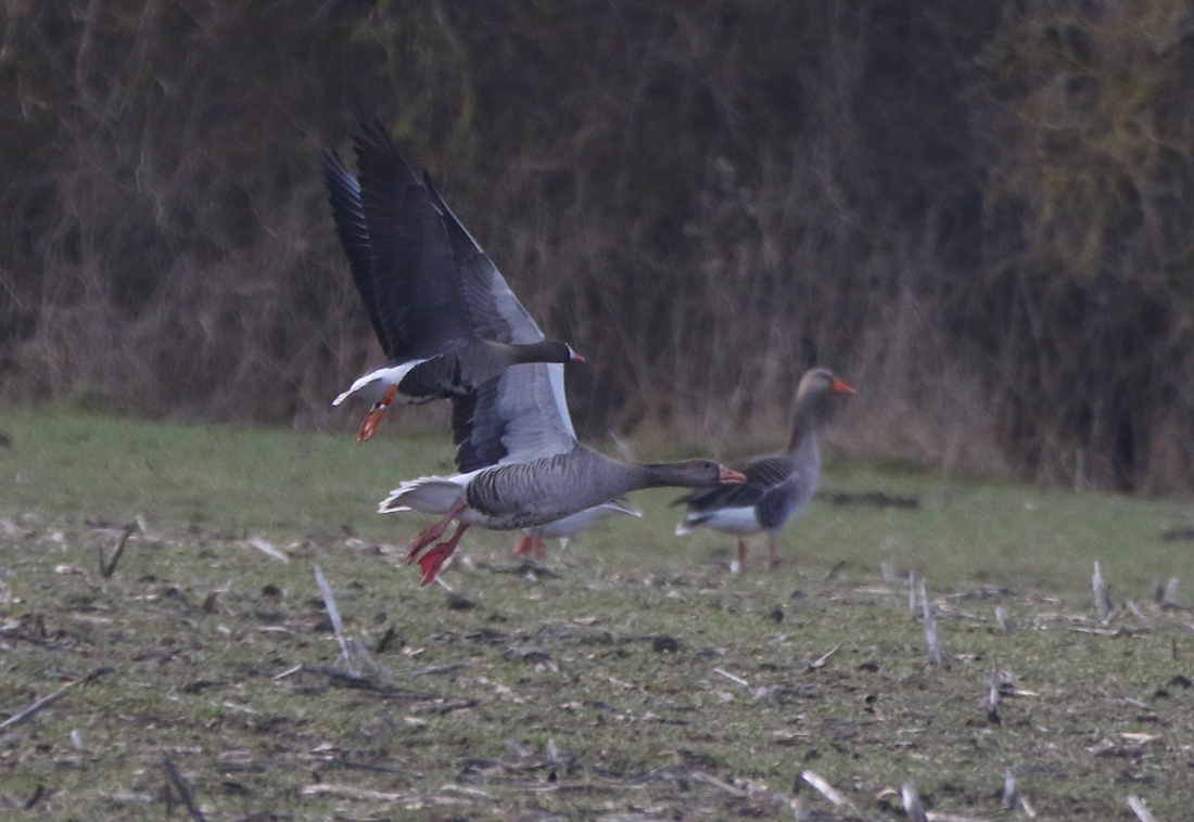 Beskrivelse: Dværggåsen gik sammen med en flok grågæs og to blisgæs.