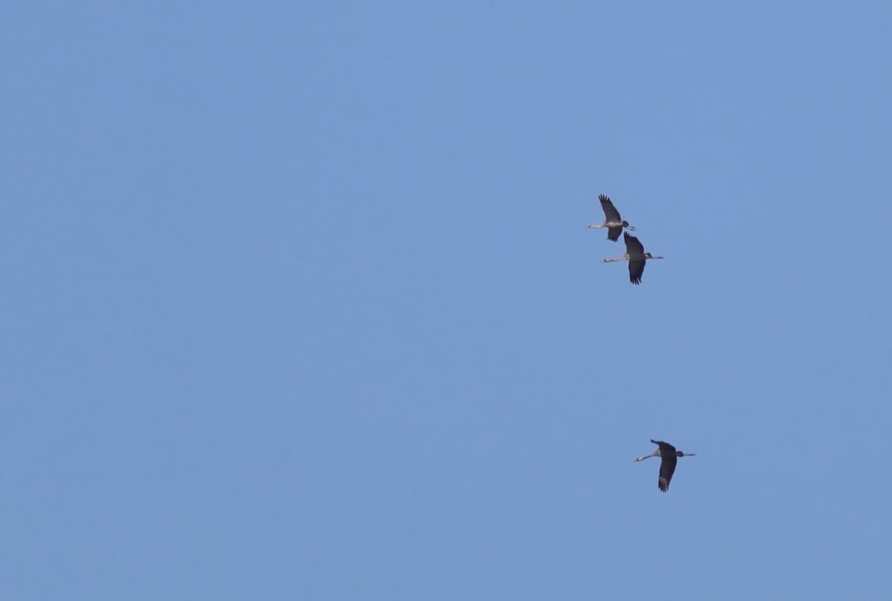 Beskrivelse: Som kulmination på tårnenes dag, trak prærietranen ud. Spændingen på obs-posten var stor, da den blev meldt ud som rastende i Troldkær, ville den trække mod Grenen? Det gjorde den. På billedet er trane nummer 2 af 3 ved at slippe, men de to sidste trak ud over havet mod Norge?