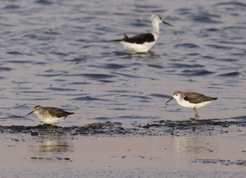 Beskrivelse: Damklire til højre er i kropslængde ikke meget større end Tinksmed, hvilket er værd at have i tankerne når man står overfor en potentiel Damklire. Læg mrke til den lyse helhedsondtryk, kanylespidse næb og meget lange ben - i form er Damklre som en let reduceret miniature af Stylteløber.