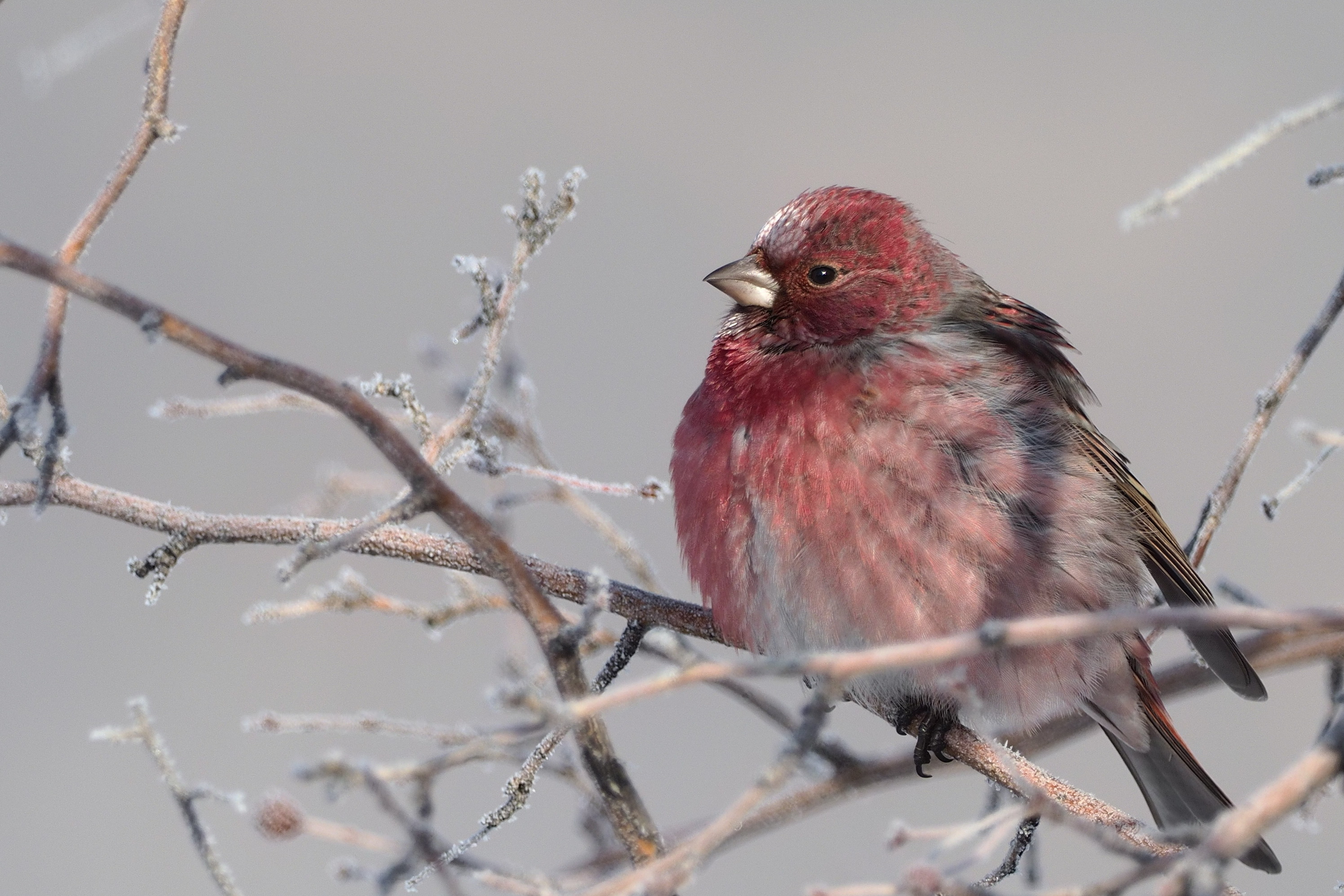 Beskrivelse: En flot rosenfinke på en kold vinterdag i Mongoliet.