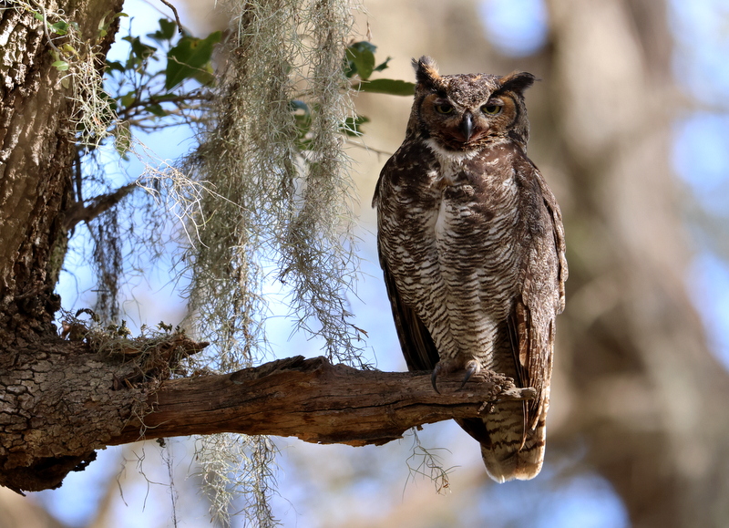 Titel: One of two parental birds in a live oak tree 150m from the fledgling. GHO is a very early breeder!