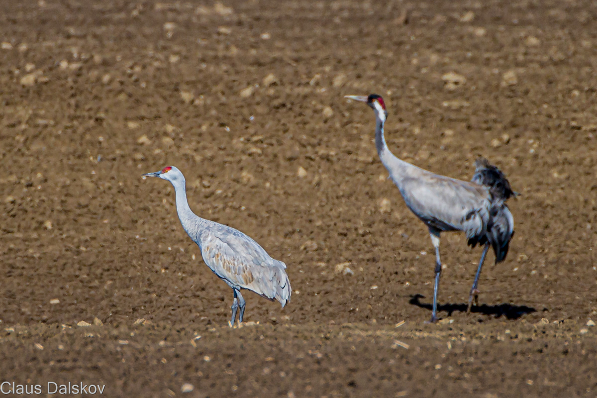 Beskrivelse: Prærietranen opholdt sig sammen med en Trane på nysået mark i max 1 time.