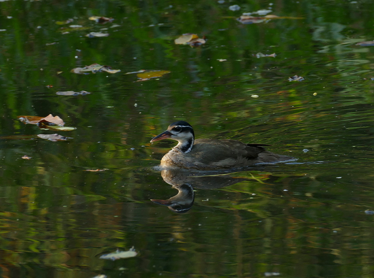 Titel: Sungrebe swimming on quiet forest stream.