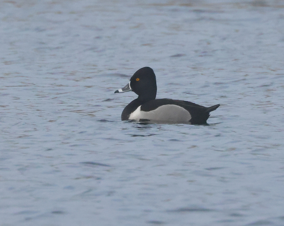 Beskrivelse: På afstand skilte halsbåndstroldanden sig ud fra troldænderne ved sine grå flanker og hvide skulderkiler, og ved nærmere eftersyn på næbbet.