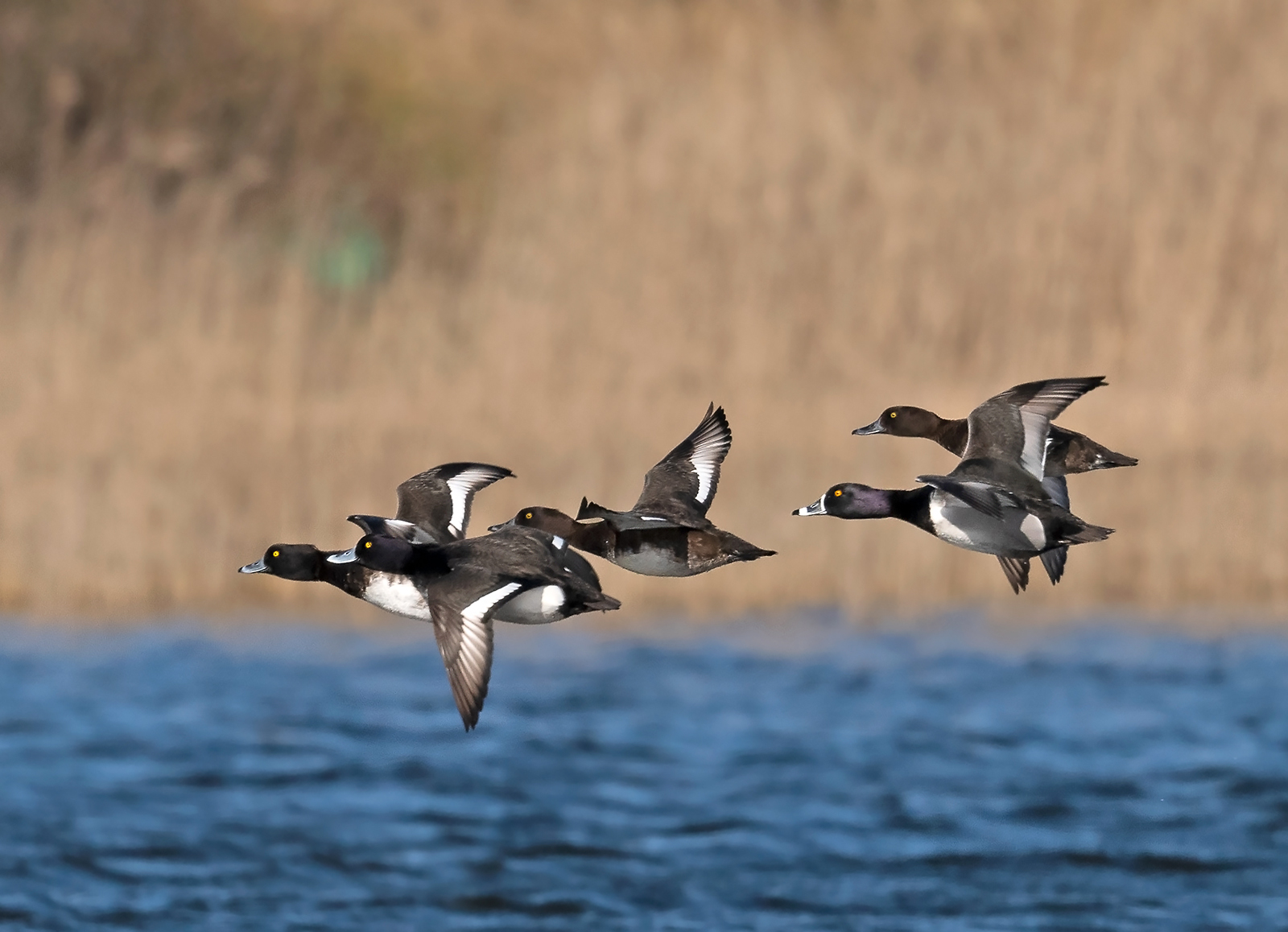 Titel: Flyvende adult Halsbåndstroldand i en flok med Troldænder