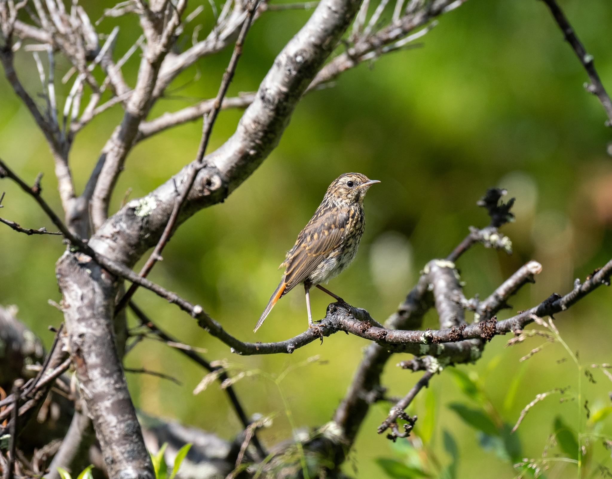 Beskrivelse: Ung blåhals i birkeskoven på vej op til trægrænsen