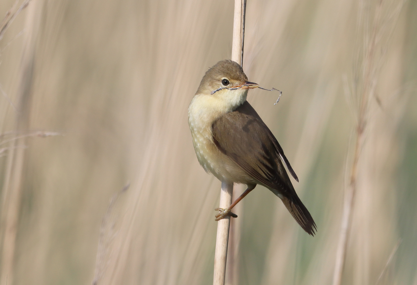 Beskrivelse: Hunnen med rede materiale sad under en meter fra hannen, som sang i vilden sky.