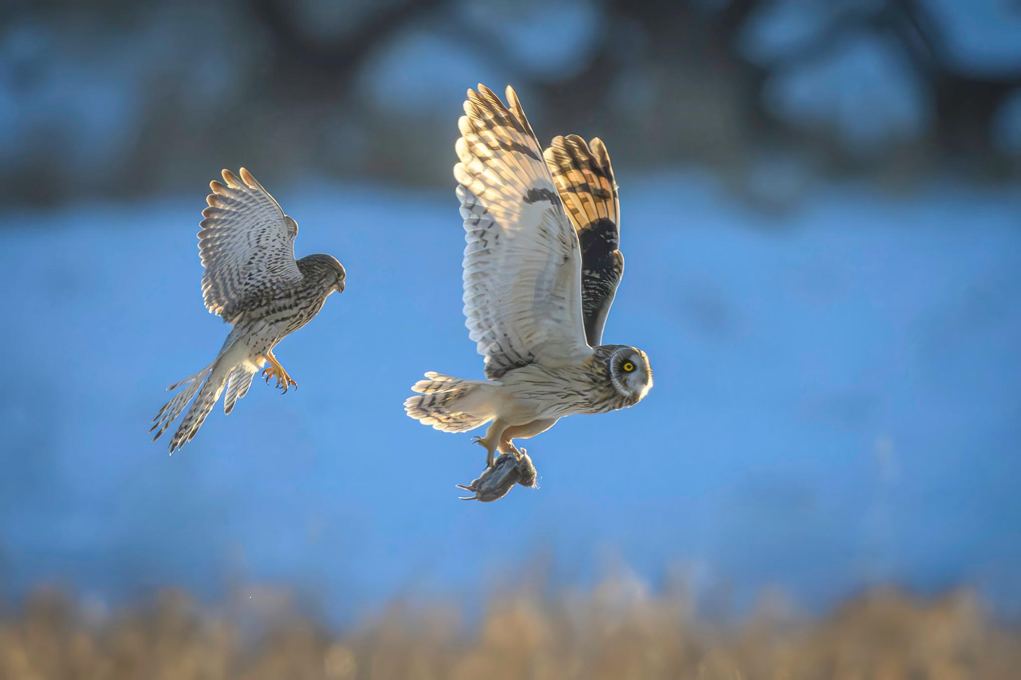 Beskrivelse: Mosehornugle med bytte jages af tårnfalk