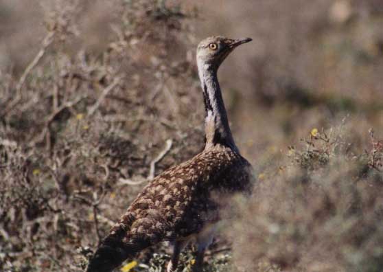 Beskrivelse: To see the Houbara Bustard was by far the greatest thrill while birdspotting on lanzarote. I stopped the car at a waterstation 1 km outside Tiagua on the way to Soo, and bumbed into to this fine creature just a few 100 meters into the plains. It was aware of me all the time, but kept on comming closer,and did eventially expose itself fully from behind the scrubs. Here it was making a funny gesture bending its neck backwards and with a strange barking sound throwing its head forward. I understood that it was telling me to leave,and the bird was following me 150 meters behind all the way to the road to make sure i disappeared.