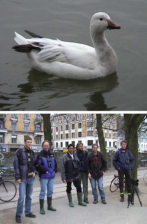 Beskrivelse: En Lille Snegås i Sortedamssøen fik mere end 40 fuglekiggere til at drage til lokaliteten. Fra venstre mod højre: Andreas Bruun Kristensen, Lars Paaby, Alex B. Bühring, Henrik T. Rask, Lars T. Rask og Jesper Bay.