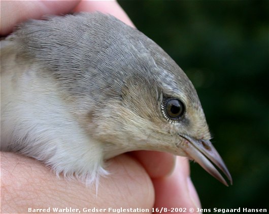 Beskrivelse: Den anden af i alt <b>tre</b> 1k høgesangere der blev ringmærket af Troels Eske Ortvad (FT) på Gedser Fuglestation fredag den 16. august 2002.