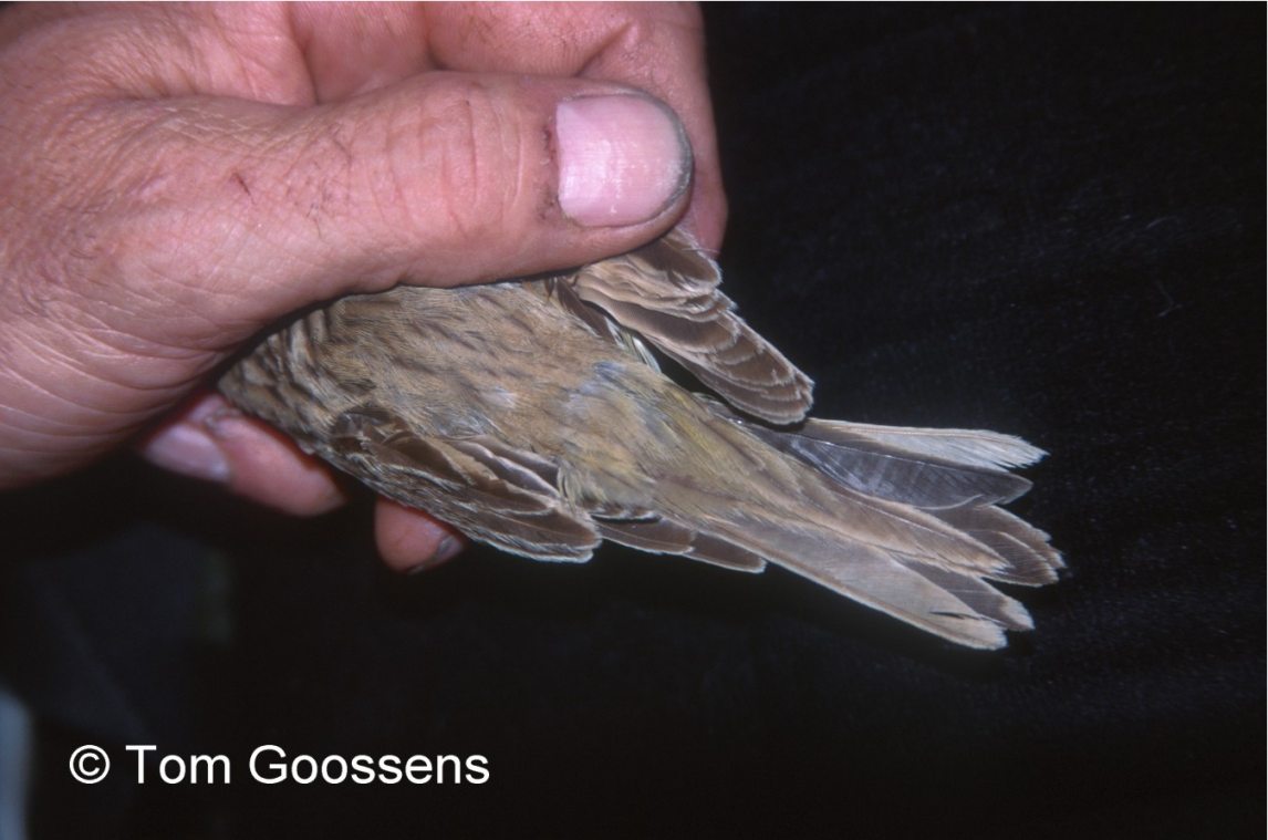 Beskrivelse: This adult female was trapped and ringed at Merksplas, Belgium. The heavily damaged tail (several tailfeathers missing on one side) is probably due to trapping and handling of the bird. The central pair tailfeathers are heavily worn and not moulted where the rest of the tailfeathers have been replaced. This concludes that we have an adult bird in female plumage. The record has not been investigated by the BHAC (Belgian rarities committee).