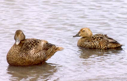 Beskrivelse: Adult female King Eider (right) with adult female Common Eider.