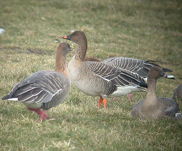 Orange farve på næb og ben adskiller sig fra Kortnæbbet Gås lyserøde. Fuglen har har ret brede lyse rande på oversidens fjer, men bundfarven er mørkere end Kortnæbbet Gås´frostgrå. Ofte er randene hos Kortnæbbet så brede, så de flyder sammen til massivt lyst på forryggen, hvor de er i god kontrast til gulbruntonet hals (som på den kortnæbbede i billedets venstre del).