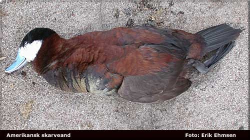 Beskrivelse: Denne amerikanske skarvand blev skudt den 2. august i Arreskov Sø på Fyn. Hermed den 2. amerikanske skarvand i Danmark som må lade livet i år.
