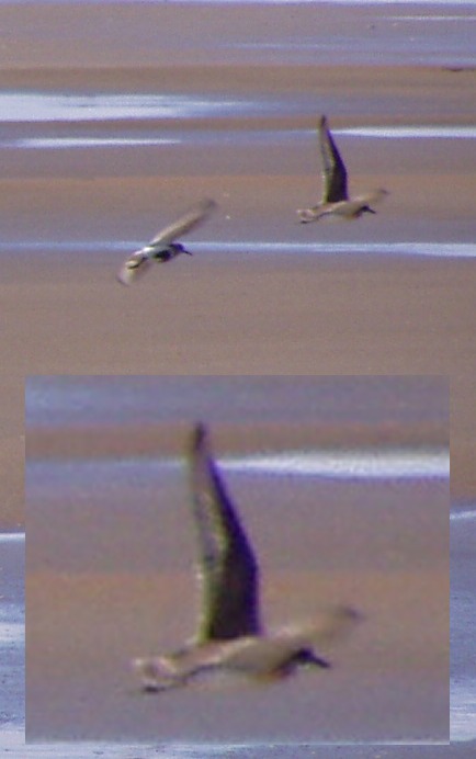 The bill appears to be relatively short and blunt and overall the body mass of the bird is more akin to Ringed Plover - lacking the heavy structure of GSP. It is very long-legged, upright in stance and particularly round-headed, this posture being identical to numerous recent LSP in the Western P. The legs also appear quite dark and quite unlike the paler lime-green colouration of GSP. In flight, the feet do not appear to project significantly beyond the tail (as they do in GSP) and the wing-bar across the primaries appears to be of uniform width and not bulging as in GSP. Although not directly important and variable within individuals, the bird lacks an obvious dark sub-terminal band on the uppertail.