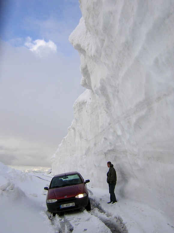 Beskrivelse: Tommy Frandsen på VP tur i det nordlige Tyrkiet i bjergpasset mellem Ispir og Sivrikaya, 2600 meter over havets overflade. Bilen har netop sat sig fast i sneen, mens den 10 meter høje mur af sne hænger faretruende langt ud over vejen, parat til at begrave de to danske birdere hvert øjeblik det skal være.