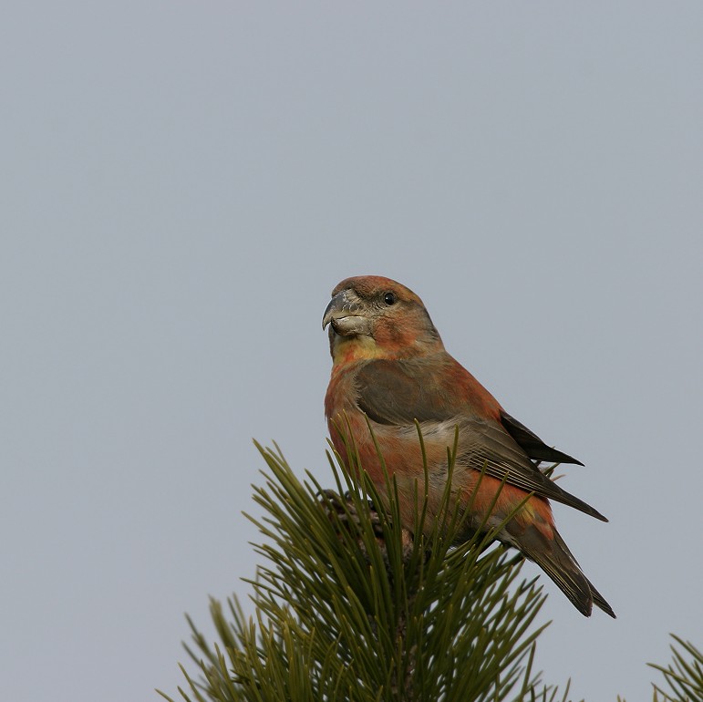Stor Korsnæbs brede, næsten kantede "papegøjehoved" fremgår her med alt tydelighed! Når fuglen lægger issefjerene går overnæbbet nærmest direkte over i panden. Det buede undernæb danner dobbelthage