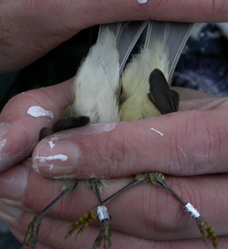 Beskrivelse: Her er billeder af fugl nr. 2 som jeg fangede den 12-10-04 om morgenen. Desværre knap så skarpe billeder, da det var tidlig morgen og ikke ret meget lys til foto. Mål på fuglen: vinge= 57mm næb= spids til skull 11.5mm og nostil til spids 5,2mm hale=46 2p = 8 1p= 6,5mm distance 1p til 2p= 23,5mm Mvh John Kyed