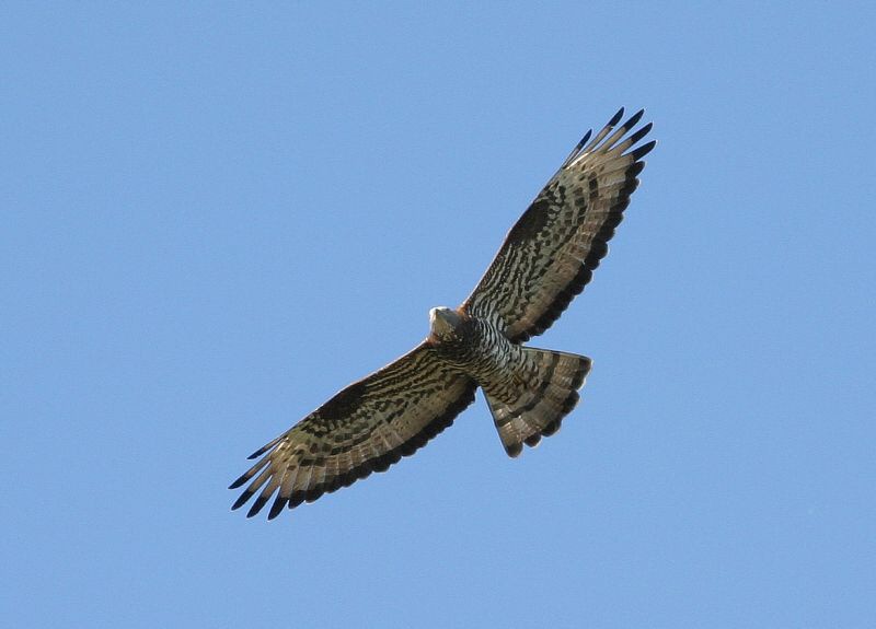 Et godt foto, der viser, hvor forskellig Hvepsevågens dragt kan være fra Musvågens. De fine tværbånd på undervingedækfjer og krop kan næsten minde om Slangeørnens - et indtryk, der undertiden forstærkes i flugten, hvor Hvepsevågens langsomme, dybe/høje vingeslag kan snyde i forhold til Musvågens mere mekaniske og hurtige. Og som hos Slangeørn ses fugle med tre, ret tydelige mørke bånd på en grålig hale; her ligger de to inderste bånd dog ret tæt på hinanden.