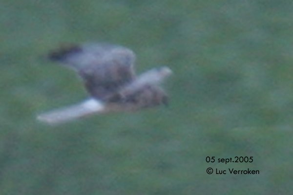 Beskrivelse: I read on the Netfugl website there have seen two (different?) <b>Pallid Harriers</b> in male 2cy plumage in Denmark in August 2005. Since we discovered a bird (1 sept) in Outgaarden, Belgium that several ornithologists determined as a Pallid Harrier 2cy male, there has been a lot of discussion. A 2cy male hen harrier is still not excluded by some. This plumage (brown upperparts, P9 and P10 still juvenile, rest of primaries are changed, secondaries mostly still juvenile (only 3 new adult ones), headpattern visible, ...) seems very rare for pallid as well as for hen harrier. There are also some doubts about the general structure of the bird, especially the wing bases. Therefore we are looking for descriptions (and if possible photos, even bad ones) of 2 cy summer and autumn males. Can you help us further with the two recent records in Denmark? Important to know (and invisible on pics): - bird is as small as black crow - head pattern (collar + long light patch above and small patch under the eye) is clearly visible - long projection of tail (when sitting on ground) - very pale tail (merges on top with short very white and unbarred rump) without any visible barring The biggest issue at the moment is the general structure of the bird that tends more to 2 calender year male Hen Harrier, unless plumage details that tends to Pallid Harrier. Thanks and best regards, Freek Verdonckt
