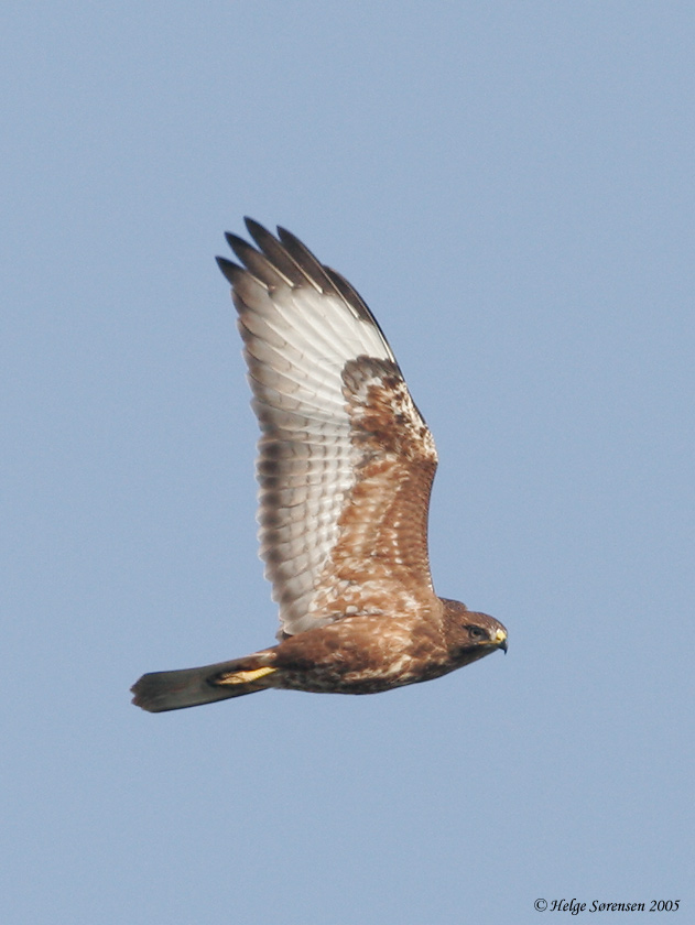 Kombinationen af meget lyse svingfjer (incl. armsvingfjerene, der hos de fleste buteo er noget mørkere) og stærkt rustrød dragt, samt næsten mangel på buteo-karakterer som lysere mellemste dækfjer og brystbånd, antyder stærkt en fugl af nordøstlig eller østlig oprindelse.