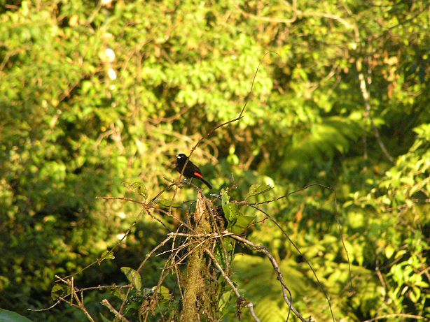 Forskellen på de 2 arter er størst hos hunnerne, hvorimod hannerne er ret ens. Ovennævnte guide fra Costa Rica (1989) skriver om hannerne: "lower back, rump, and upper tail-coverts brilliant scarlet (slightly more orange in Pacific race)". På dette grundlag synes jeg, at fuglen på dette foto ligner "the Pacific race", dvs. hvad der i dag kaldes Cherrie´s Tanager Ramphocelus costaricensis, og i så fald ligger fotografiet under en forkert art.