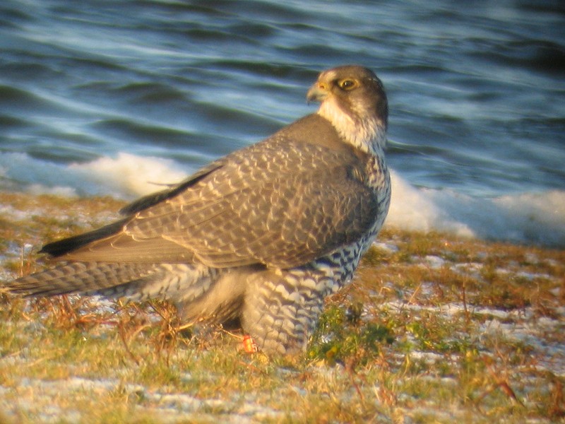 På billedet kan man se en rød farvering med et tydeligt "1", på venstre fod. Meget tyder på at fuglen er ringmærket i Jämtland eller Härjedalen, i det svenske Projekt Jaktfalk, men det vides ikke med sikkerhed endnu.