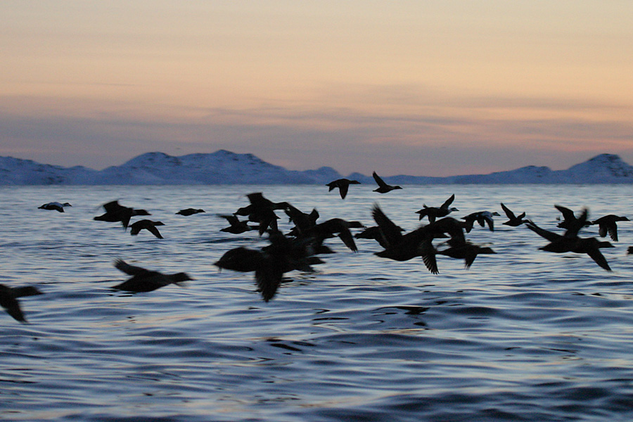 Beskrivelse: En blandet flok af ederfugl og kongeederfugl på aften træk mellem den ydre del og den indre del af Godthåbsfjorden. Undersøgelser ved Nuuk har vist at ederfuglene venter til om natten med at fouragere - muligvis for at undgå predation fra havørne.