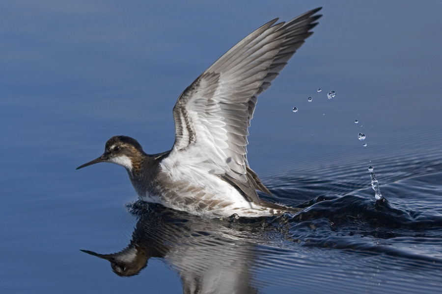 Beskrivelse: Grønne Ejland i Disko Bugt huser een af Grønlands tætteste bestand af svømmesnepper - sandsynligvis et resultat af de mange ynglende havterner der yder beskyttelse mod predatorer. Denne han er fotograferet lige før den letter fra vandet.
