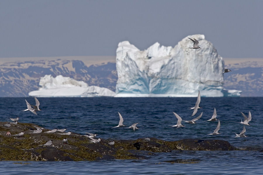Beskrivelse: Nord for øgruppen Grønne Ejland ligger Ilulissat Isfjord og spytter den ene store isbjerg ud efter det andet, hvilket danner en fin baggrund for de rastende havterner på øerne.