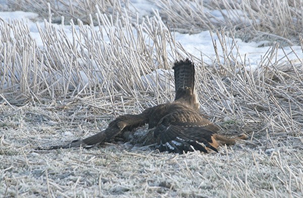 Beskrivelse: Musvågen har hele hovedet inde i harekadaveret for at få 'kød på bordet'.