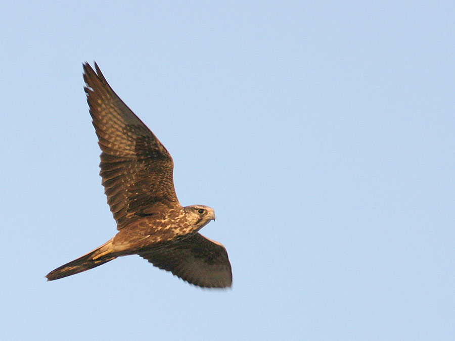 Den unge Laggerfalk kandiderer til titlen som den mørkeste af de store falke. Som det ses kan det meste af undersiden samt dækfjerene være varmt mørkebrune, og også svingfjerene er tæt båndede. Der er dog tendens til lysere håndflade.