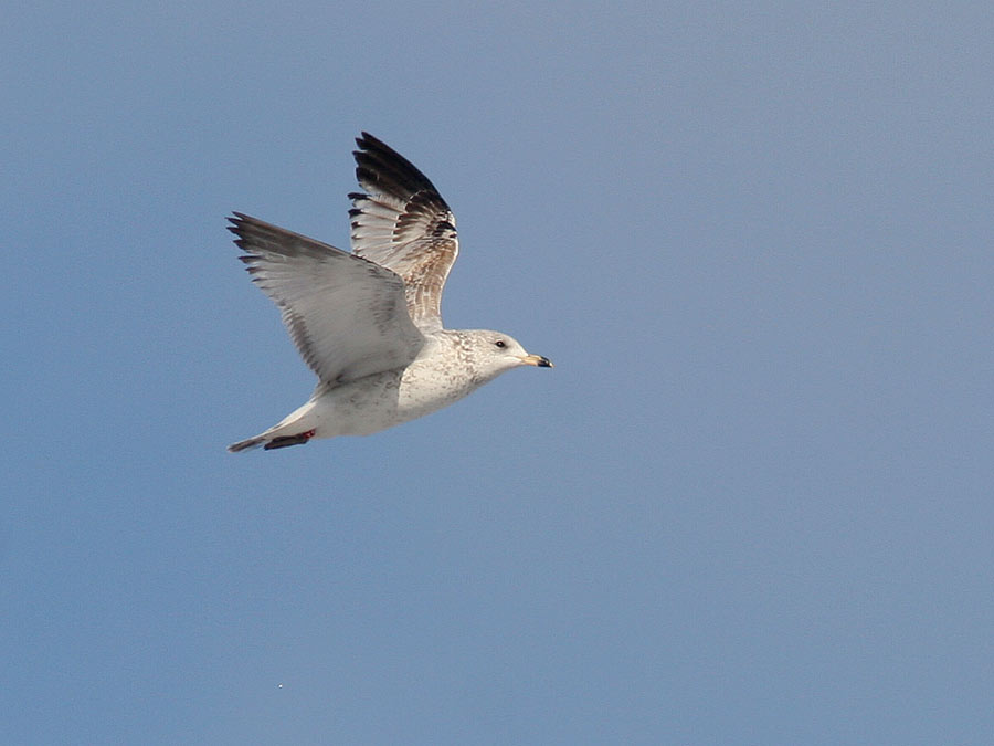 I flugten viser Nærums ringnæbbede Måge den meget hvide undervinge, hvor armsvingfjerene står tydeligt ud som et mørkt panel. Ringnæbbet måge har oftest dette udbredte hvide område på undervingen, da de fleste har svagere mørke tegninger på spidserne af dækfjer og armhulefjer i forhold til Stormmåge. Et godt, men tit lidt overset kendetegn.