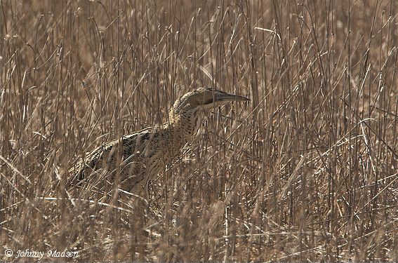 Beskrivelse: Rørdrummen har det hårdt for tiden, hvor søerne er frosset til. Denne her sneg sig rundt i en højtliggende korn brakmark, hvor der vist absolut intet føde er at finde.