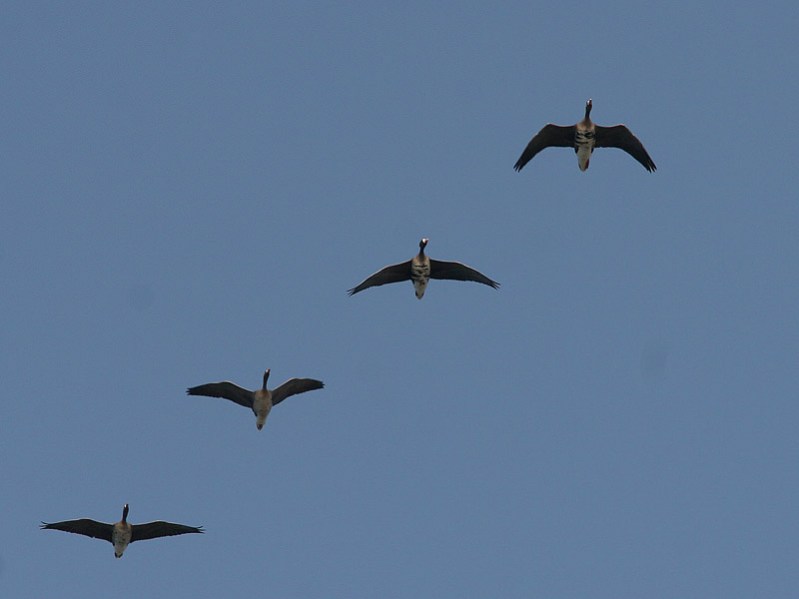 Flok på 4 trækkende Dværggæs ved Gedser. Fløj med meget hurtige vingelslag. De adulte havde selv på afstand meget tydelig hvid blis. fuglene kom direkte imod os - og vi har upassende tavse under observationen, der nær ej var blevet fotodokumenteret (da vi på det tidspunkt mistænkte Blisgæs - der jo blev foreviget smukt for nogle dage siden ved Svinø).