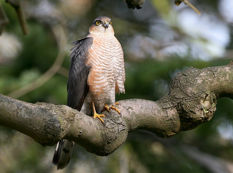 Hvis man sammenligner med det efterflg. billede af hannen, ses det, at hunnen har gul iris, hannen mere orange; hunnen har tydeligere hvid øjenstribe og ikke så mange strittende fjer på bugen