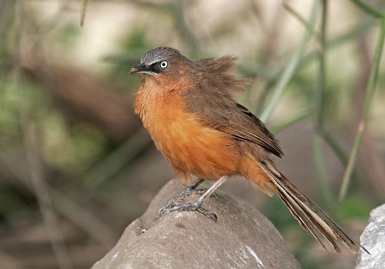 Man ser straks på næbbet og kropsformen, at det er en babbler. I Østafrika er der to røde babblers - Rufous Chatterer og Scaly Chatterer. Scaly er den mindst røde - faktisk nærmest rødbrun, er skællet på brystet og har desuden et nøgent felt omkring øjet, som fuglen på billedet mangler. Der er altså tale om en Rufous Chatterer