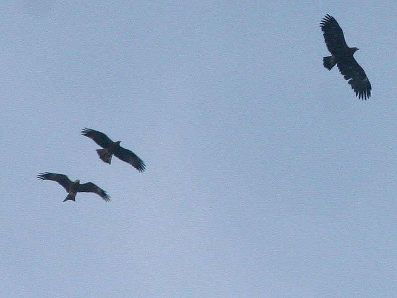 Dværgørnen er den midterste. Sammenlign formen med Sort Glentes, og bemærk især Sort Glentes lidt slankere vinger med længere fingre, samt lyse felt rundtom knoen (der dog generelt er tydeligere hos indiske fugle end i Europa), samt Dværgørnens hale med skarpe hjørner, ala Sort Glente, men med lysere grundfarve og tydelig afrundet halemidte. Trioen kompletteres af en immatur stor Skrigeørn: sortbrun på dækfjerene, lidt lysere på svingfjerene og med hvidt komma rundt om knoen - en tegning, der kan minde om unge Rørhøges.