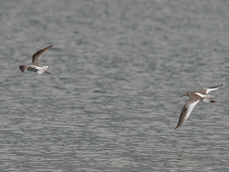 Beskrivelse: Damklire i flugten med Rødben. Damklires størrelse ligger mellem tinksmed og Rødben, hvilket kan gøre den ret let at finde i ansamlinger af klirer. Hele foden - og ofte en del af tarsen - går ud bag halen, og i denne position er det typisk, at man intet ser fortil; her ville den mere storhovede Hvidklires hoved og forkrop fortsat kunne ses. Damklire har normalt lidt lysere armsvingfjer, hvilket anes her. Hos Hvidklire er hele vingen af nogenlunde samme farve.