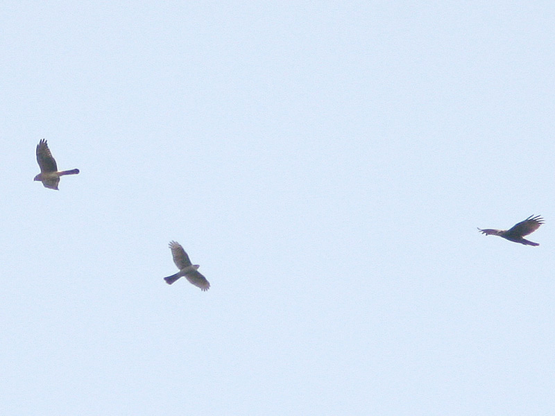 Beskrivelse: 2K han Steppehøg demonstrerer her, hvor lille han Steppehøg han kan være. Fuglens kropsstørrelse matcher jo meget godt Spurvehøgens! Spurvehøgs hånd er bred, og kan sammenlignes med Blå Kærhøgs - Steppehøgen har spids hånd, der her er tydeligt smallere end armen. Steppehøgens spidse hånd kan passende sammenlignes med håndformen hos Rørhøgen til højre; Rørhøg har bred og fyldig hånd, og noget lignende er tilfældet med Blå Kærhøg.