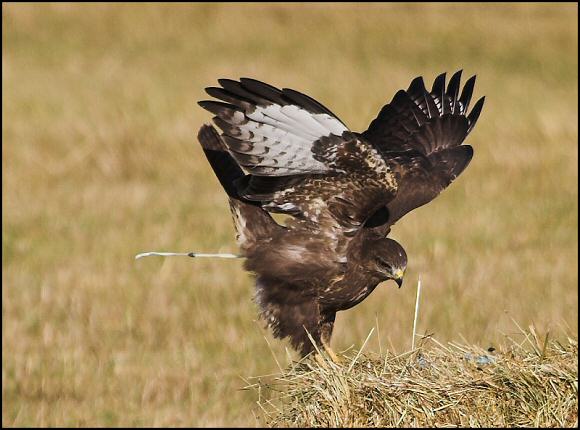 Der var på denne nypressede halmballe anrettet flere måltider for vor musvåge, så bemærk venligst, at denne ungdommelige fugl sender sin omsatte føde vandret bort fra spisestedet. Altså ikke noget med at besudle sin egen rede - undskyld spiseplads.