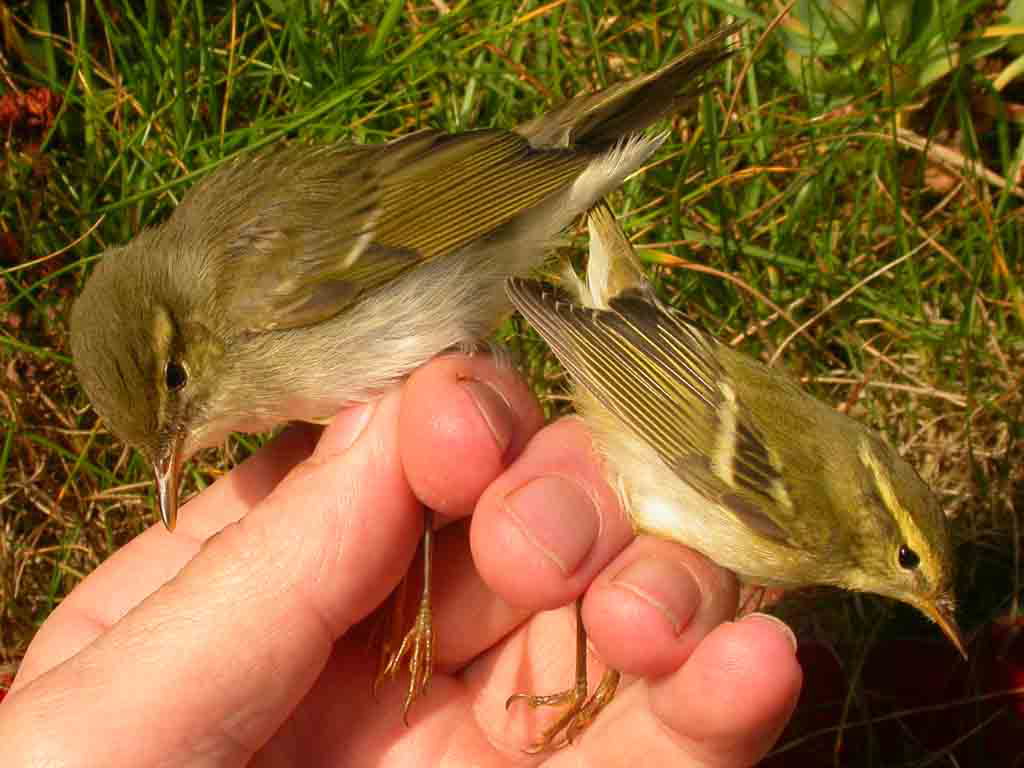 Beskrivelse: Disse to blev fanget i helgolandsfælden på Nólsoy af Jens-Kjeld Jensen. Dette er blot 2.fund af Nordsanger på Færøerne. Hvidbrynet Løvsanger er regelmæssig trækgæst. Der er set 2-3 i år.