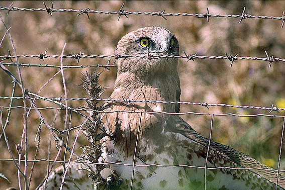 Beskrivelse: Fuglen slog efter et bytte lige foran mig, men kiksede. Da den skulle lette måtte den, på grund af vindretningen, først kravle over hegnet inden den kunne blive airborn.