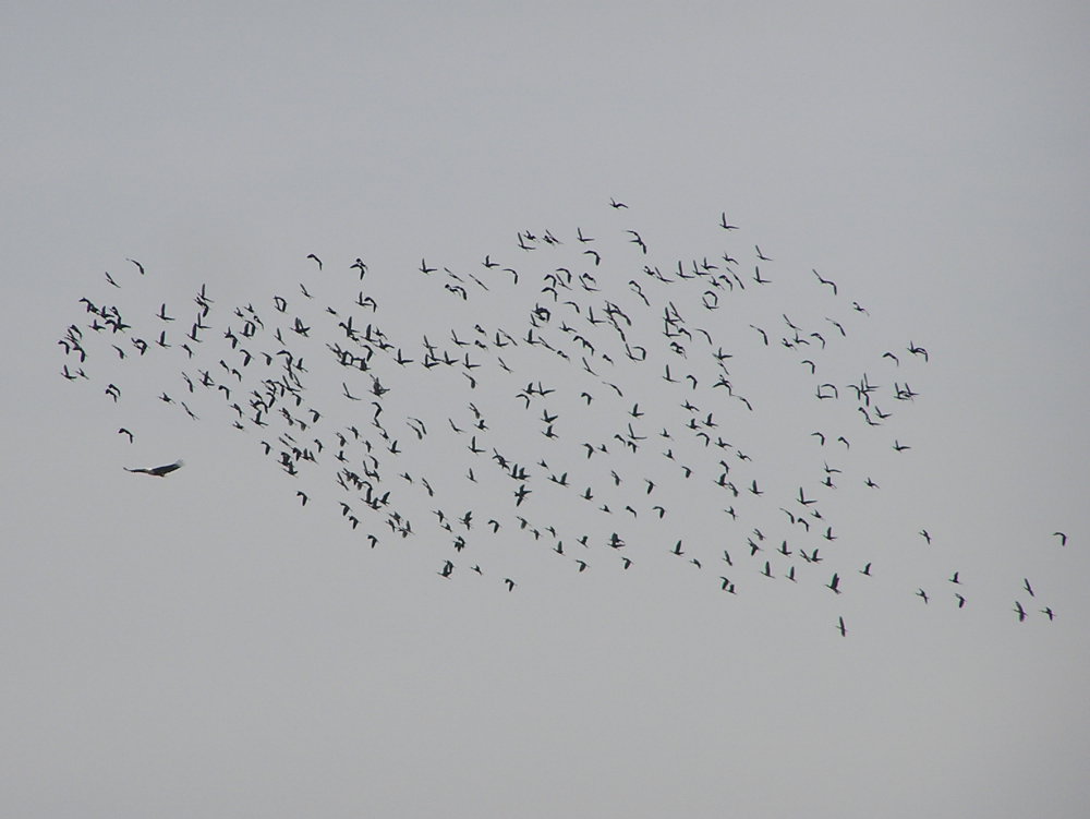 Der er forøvrigt også en bredvinget fætter på billedet i venstre side - mon det er den, der har fået flokken på vingerne?