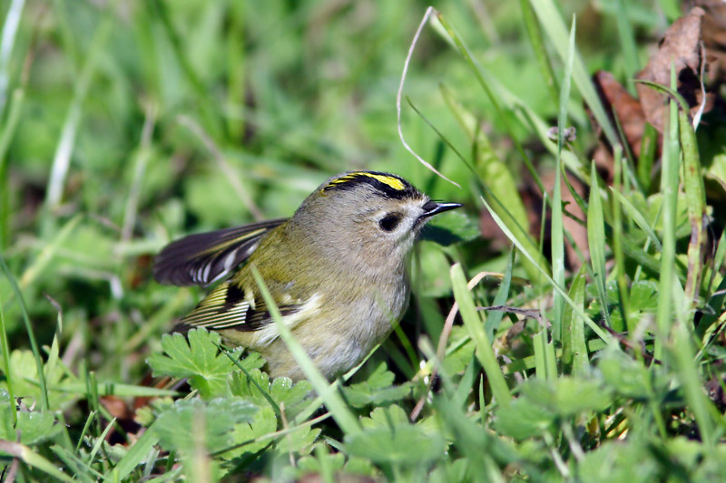 Beskrivelse: En af mange hundrede fuglekonger, som rastede på øen denne dag. Dagen før var ca. 400 Fuglekonger blevet ringmærket, og mange af dagens fuglekonger bar ring - dog ikke denne fugl, der ivrigt fouragerede i det høje græs.