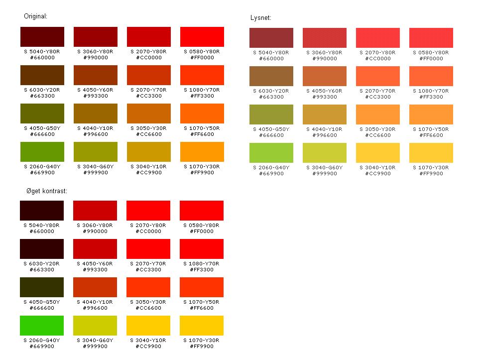 Beskrivelse: I forbindelse med debatten om hvorledes den digitale billedbehandling påvirker farverne har jeg lavet et lille forsøg. Jeg har hentet en farvepallette fra nettet, og herefter lavet en henholdsvis lysnet, og henholdsvis øget kontrast kopi af originalen, således at man direkte kan aflæse effekt.