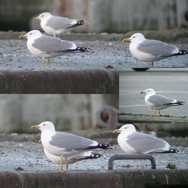 Beskrivelse: Samme fugl ses på disse fotos: http://netfugl.dk/pictures.php?id=showpicture&picture_id=15244 og http://aarhusbirder2007.blogspot.com/2008/01/middelhavsslvmge-larus-michahellis-5k.html På billedet ses bl.a. svagt mørkere rygfarve, mere strømlinet jizz, lidt længere tibia, samt svagt mørkere iris end hos Sølvmåge. Collagen viser meget godt, at hovedformen ændrer sig alt efter posituren.