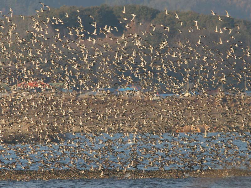 Beskrivelse: En lille del af en flok på min. 25.000 Sibirisk Krikand ved Geum-flodens munding. Op til 600.000 fugle - langt over 95% af verdensbestanden - overvintrer på ganske få steder i Sydkorea. De tilbringer dagene i meget tætte flokke, og flyver om aftenen i store skyer til fødesøgningsområder på rismarker.